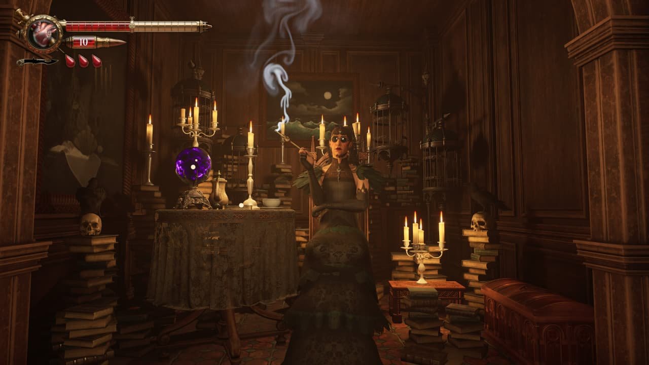 As armas são um grande destaque. Suas animações de recarregamento são criativas e visualmente marcantes, o que me deixou ansioso para encontrar novas armas e descobrir quanto sangue exigiriam de Gabriel. Há um certo prazer masoquista ao ver o personagem se ferindo com agulhas, com o sangue escorrendo diretamente para o armamento de maneira nada confortável.