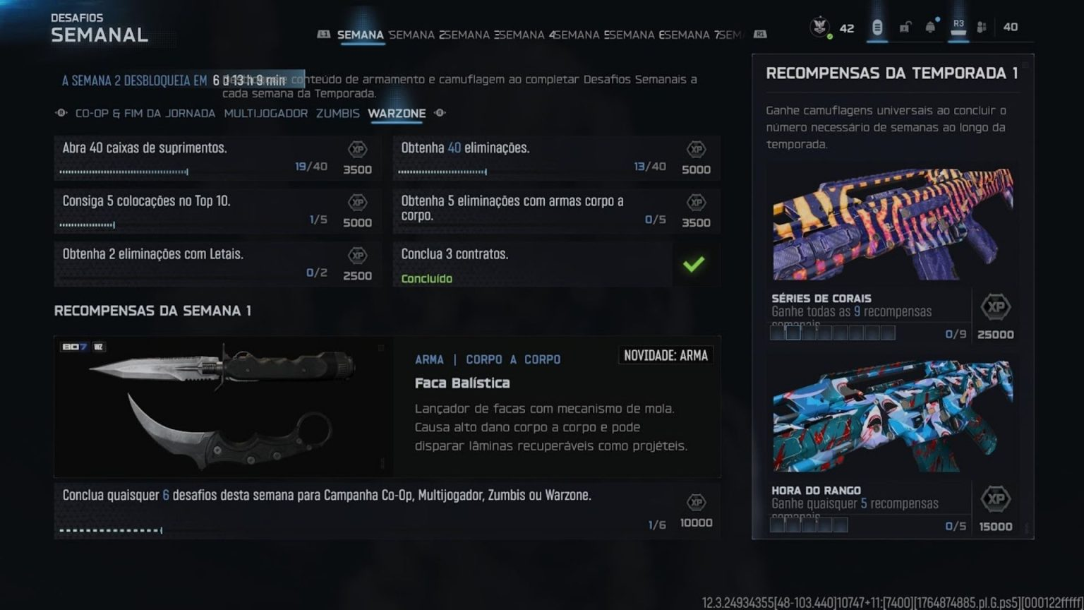 | Faca Balística (Arma branca) | Complete 6 desafios da Semana 1 |