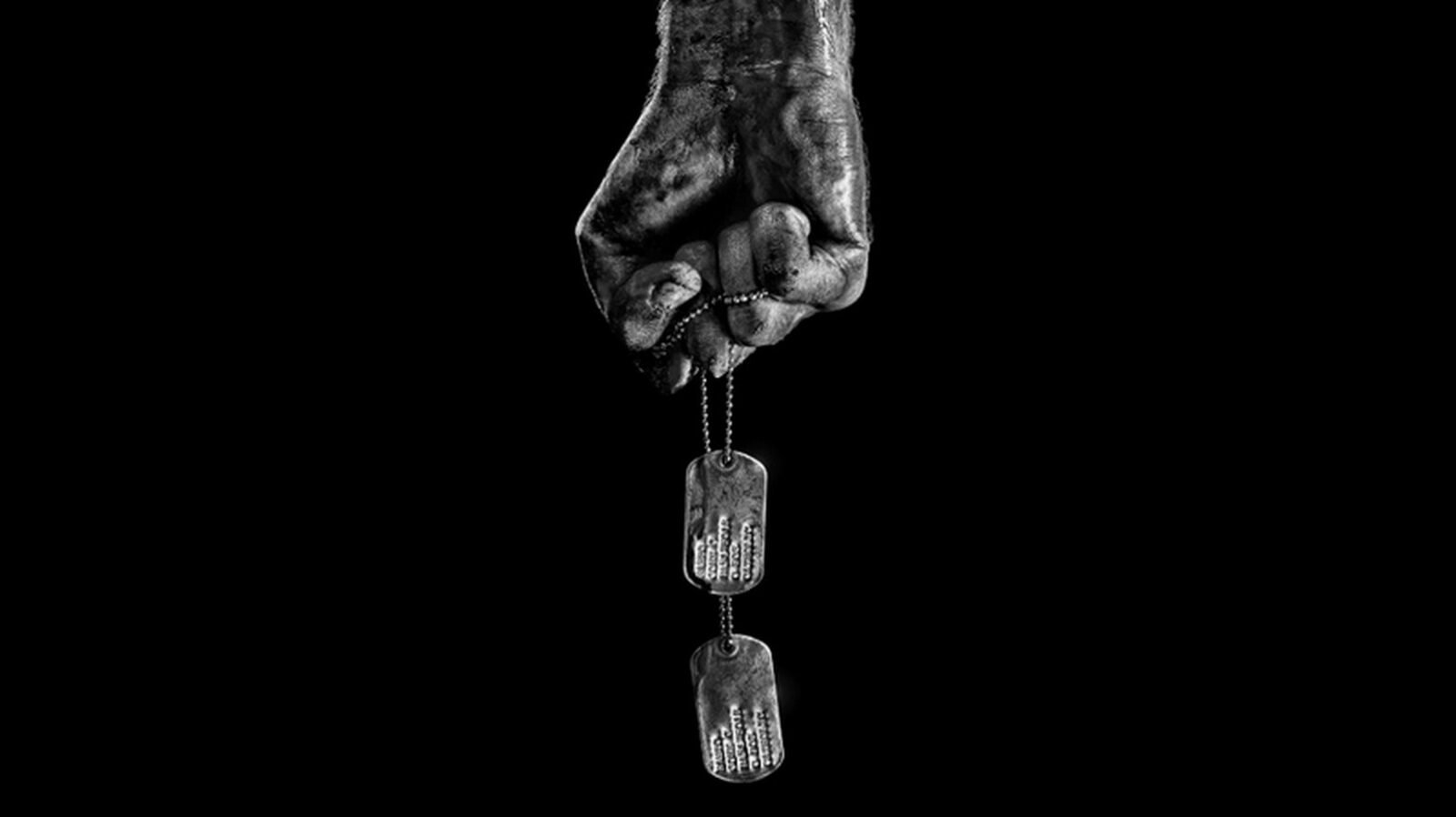 O pôster mostra um braço segurando uma placa de metal de identificação militar. Ampliando a imagem é possível ler o nome “John Rambo” e sua identificação como católico.