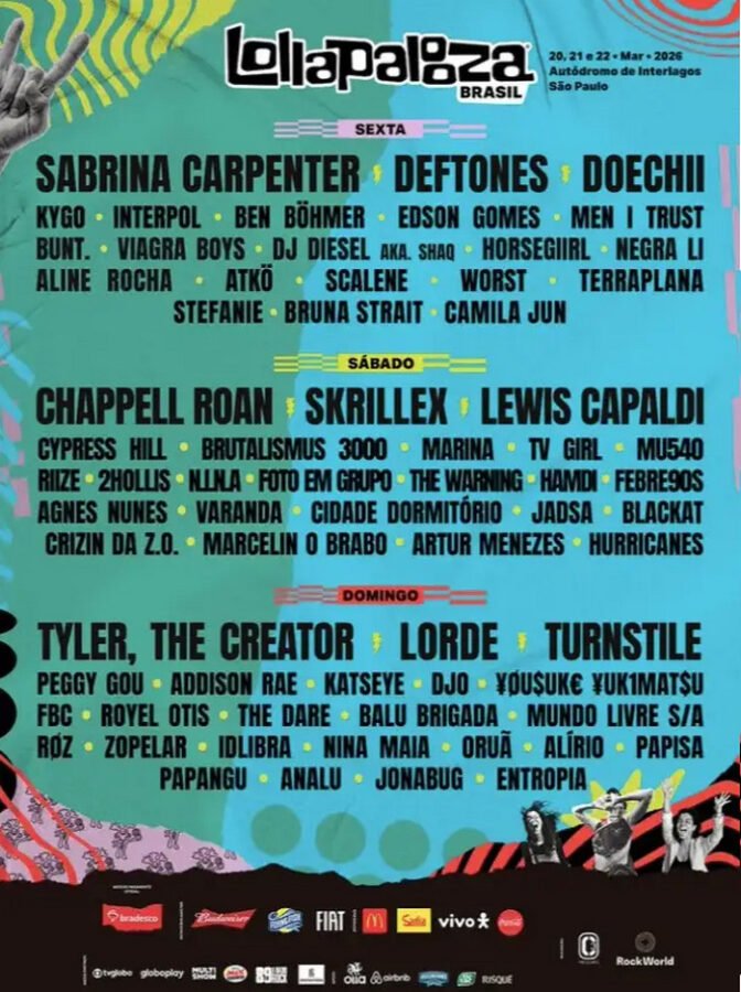 A escalação do Lollapalooza 2026 com as atrações divididas por dia foi divulgada nesta quarta-feira 1 de outubro. Sabrina Carpenter irá encabeçar o palco principal na sexta-feira, 20 de março, Chappell Roan canta no sábado (21) e Tyler, The Creator encerra o festival no domingo 22. Como já era esperado, D4VID e Lola Young, que estavam presentes na lista de artistas anunciados em 28 de agosto, não virão mais ao Brasil. O festival será realizado novamente no Autódromo de Interlagos, em São Paulo.