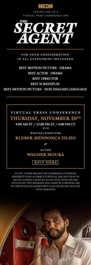 Veja o convite feito pela NEON para a coletiva, já mirando o Oscar, de O Agente Secreto: