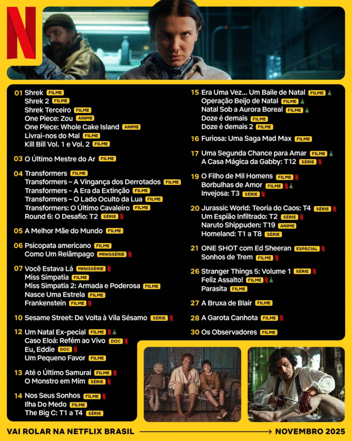 Novembro chegou com uma agenda cheia na Netflix. Séries que retornam com novas temporadas, produções inéditas para maratonar e filmes que já vinham chamando atenção no circuito internacional. Também tem espaço para documentários e realities que exploram histórias reais. Abaixo, você confere os principais lançamentos do mês.