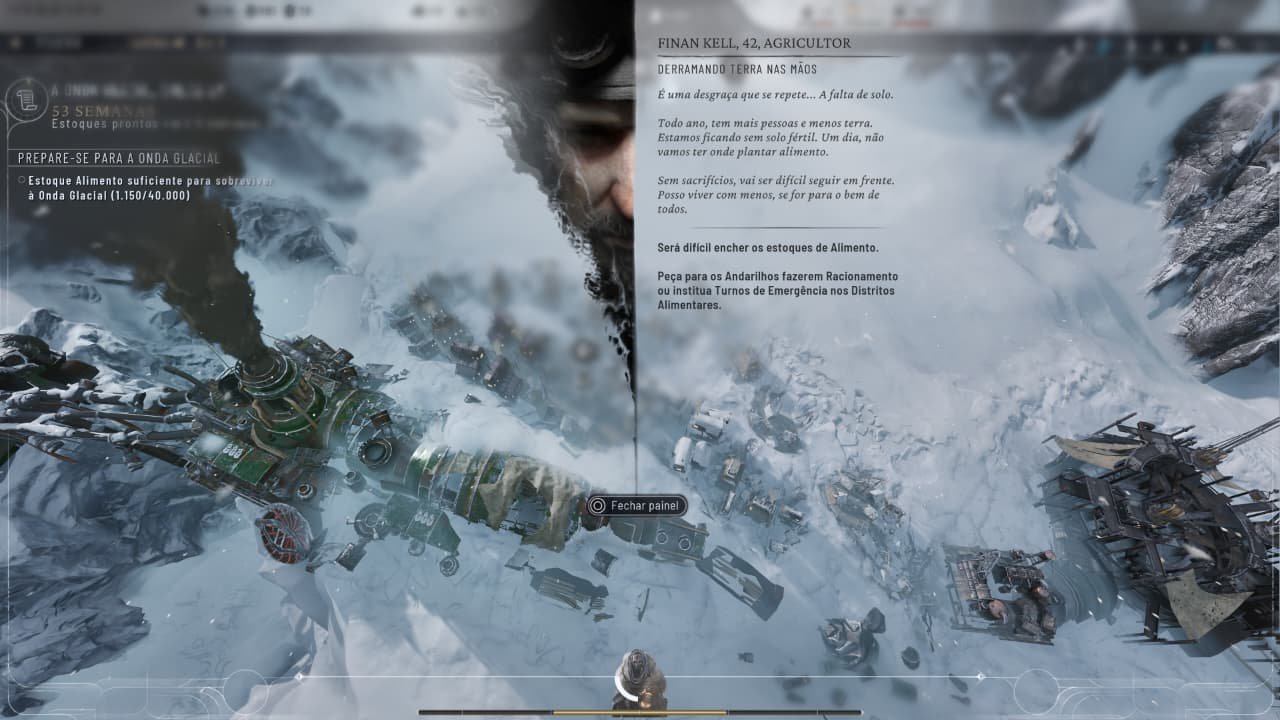 Precisamos nos proteger das ondas glaciais bruscas, e outros acontecimentos que irão ser introduzidos nos próximos capítulos ao longo do jogo, que acontecem nesse mundo, e temos dias contados até ela chegar (mais ou menos como funciona a chuva solar de The Alters), então temos que conseguir recursos e mantimentos o suficiente até ela chegar, e ninguém passar um perrengue tremendo até avançarmos mais no jogo, feito isso o ciclo se repete até migrarmos para nossa próxima evolução junto aos residentes da nossa cidade.