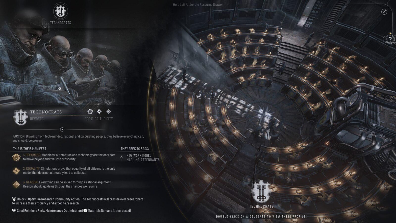 Os elementos políticos do jogo também são essenciais para criar a atmosfera dele, e você como líder precisa gerenciar várias pessoas que também tem diversos tipos de visões políticas, entre trabalhadores, naturalistas, religiosos, extremistas, e por aí vai.