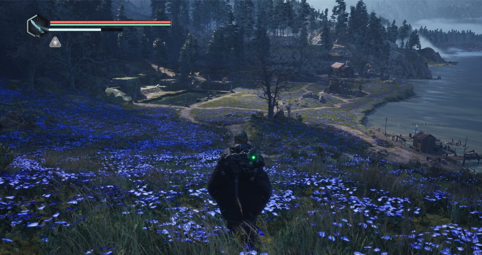 Aqui não tem minimapa cheio de ícones coloridos. Você aprende se virando. Logo no começo, na floresta Senedra, um velho escondido no porão dá a primeira missão “à moda Hell is Us”: Jova fica nos pântanos de Akaza, mas você só chega lá com um veículo. Pra encontrá-lo? Siga os sinos de vento espalhados na floresta.