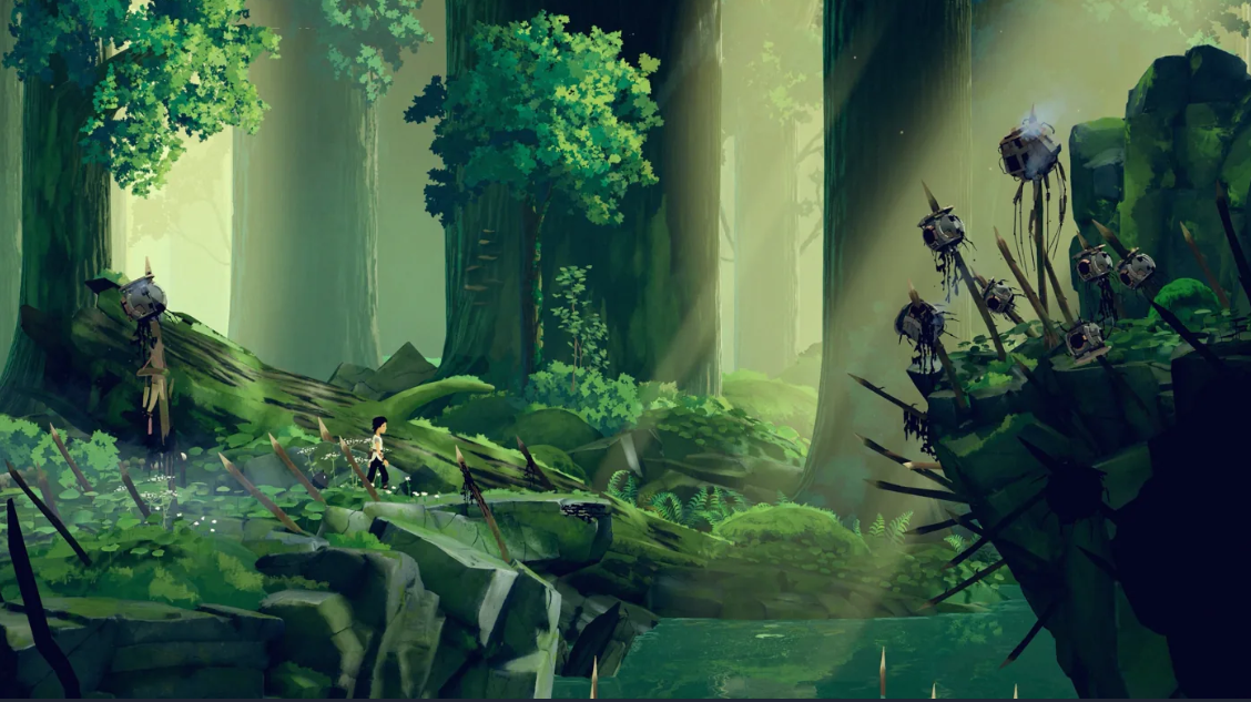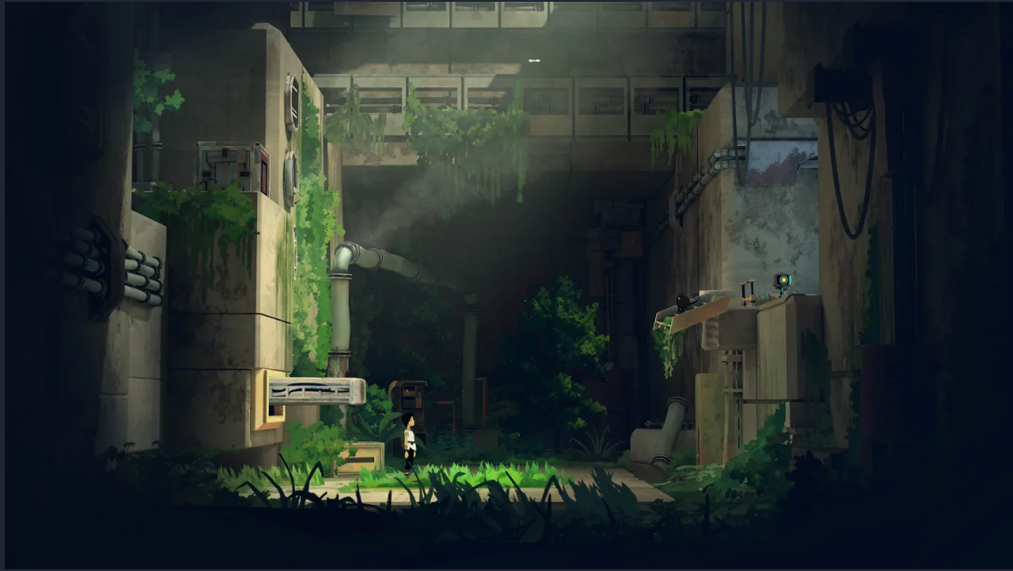 Há também uma forte sensação tátil nas interações. Puxar alavancas, movimentar máquinas pesadas e ativar mecanismos transmite peso e impacto. O som metálico das engrenagens ecoando em cavernas ou instalações abandonadas reforça a escala do mundo e faz Lana, e o jogador, se sentirem pequenos diante daquela tecnologia colossal.