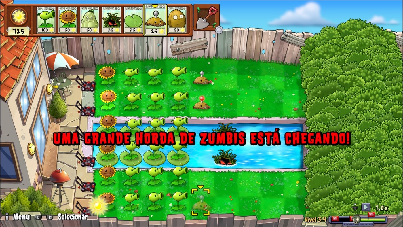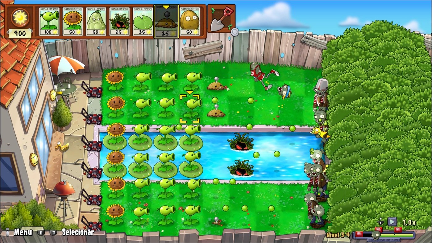 Plants vs. Zombies é um tradicional tower defense, basicamente o jogo consiste em resistirmos ao ataque dos zumbis, protegendo o nosso jardim a qualquer custo. Para isso, usamos diversas plantas, com diferentes “habilidades” de ataque. Por exemplo, a Disparervilha dispara uma ervilha contra os zumbis, enquanto a Duplervilha dispara duas ao mesmo tempo.