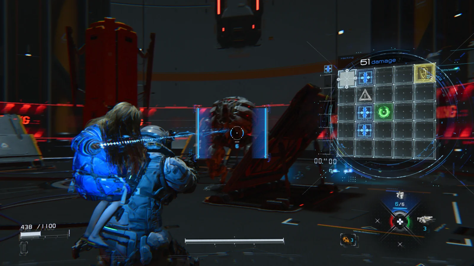 A progressão acontece por meio de um recurso coletável chamado filamento. Esse material é usado no abrigo para imprimir novas armas e habilidades. Conforme o arsenal cresce, é possível investir em melhorias como aumento de dano, capacidade de munição e cadência de tiro. O mesmo vale para os sistemas de hacker da Diana, que também evoluem com o tempo.