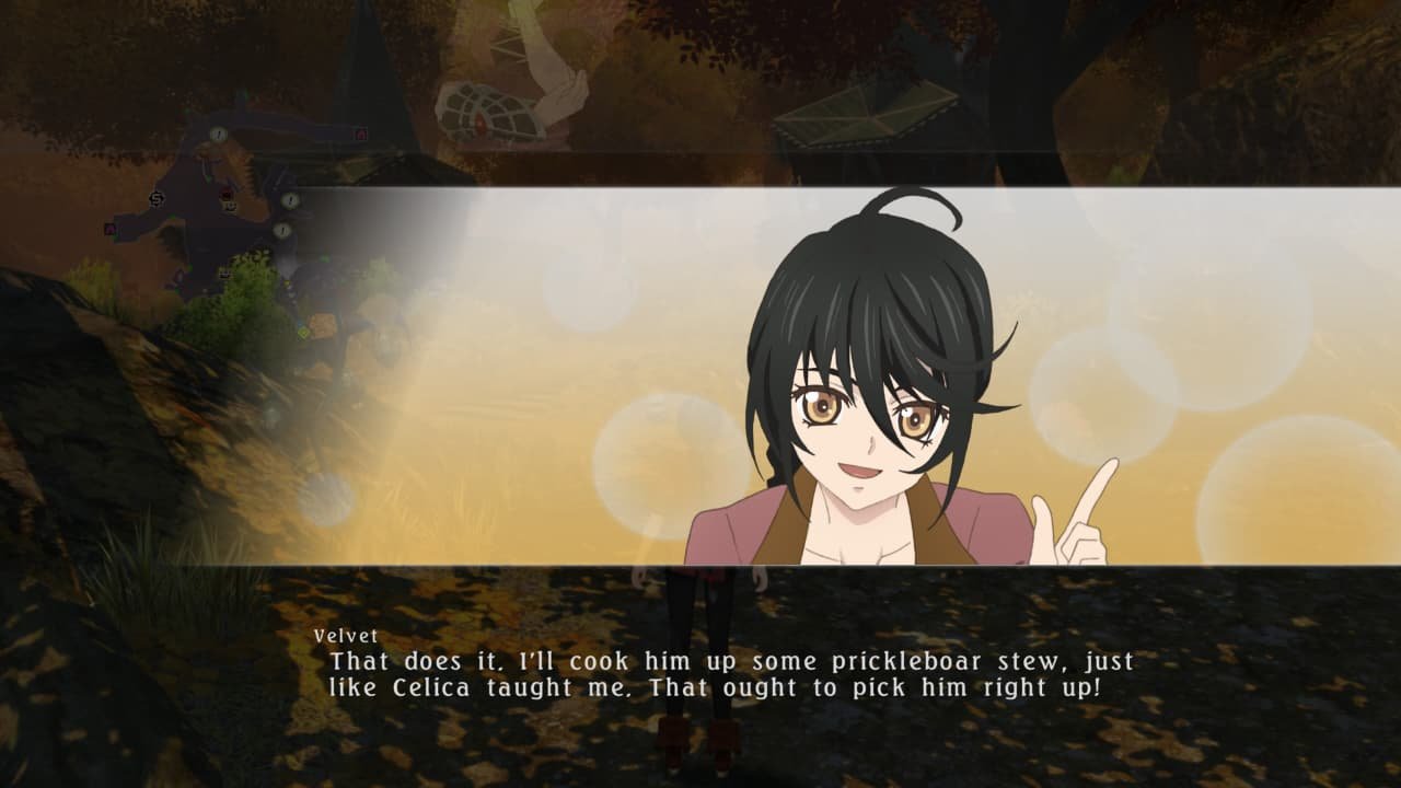O jogo nos dá um pano de fundo típico e bem clichê da própria franquia. Vemos Velvet no início do jogo como uma pessoa radiante e esperançosa, com uma relação muito afetuosa com seu irmão mais novo e todos da vila. Sua arte nas portraits dos diálogos nos apresenta uma moça cheia de cor e vida, e, após toda a tragédia, ela muda drasticamente, se tornando mais fria, distante e mais rígida, com uma sede de sangue gigantesca pela tragédia que a atingiu. Dá para dizer que ela finalmente alcançou a sua fase de “gótica trevosa”.