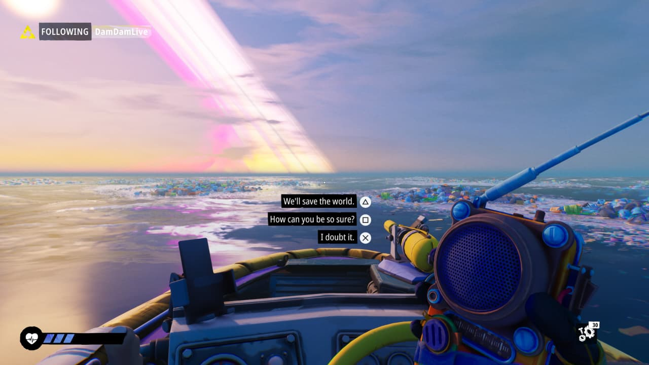 Como eu disse acima, a sua escolha molda o rumo que o mundo vai seguir, entre elas temos barras de atitudes no melhor estilo Paragon e Renegade de Mass Effect. Aqui temos escolhas para o benefício da humanidade, escolhas focadas para o bem do meio ambiente, escolhas que visam mais a sobrevivência do jogador, escolhas de ser um verdadeiro pestinha, aqui conhecida como Troublemaker – ou encrenqueiro, e uma barra medindo também o quanto você é cooperativo com outros jogadores. Cada barra dessas vai aumentando de acordo com as suas escolhas, e elas afetam o mundo significativamente, não só para você, mas para o jogador que decide te seguir em sua jornada.