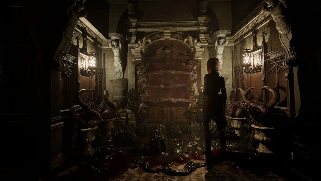 O convento é claustrofóbico, reforçando a sensação de isolamento, enquanto os ângulos de câmera fixa lembram os clássicos Resident Evil. Em alguns corredores, a câmera acompanha Caroline, ampliando a sensação de escala e adicionando um toque moderno ao estilo antigo.