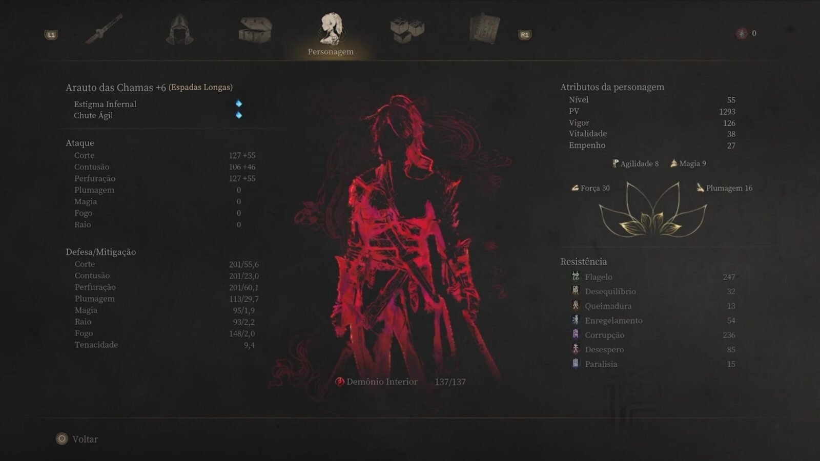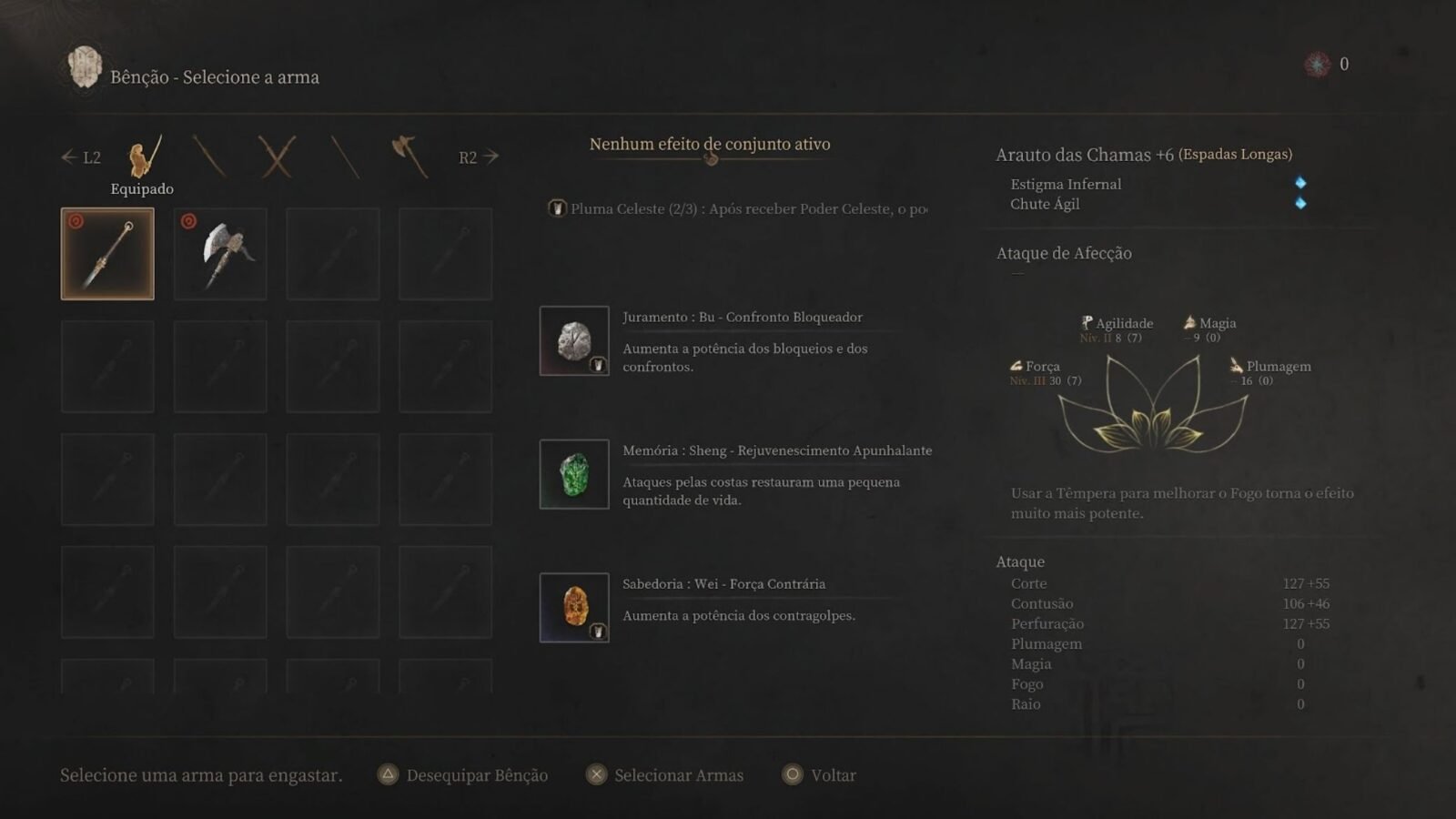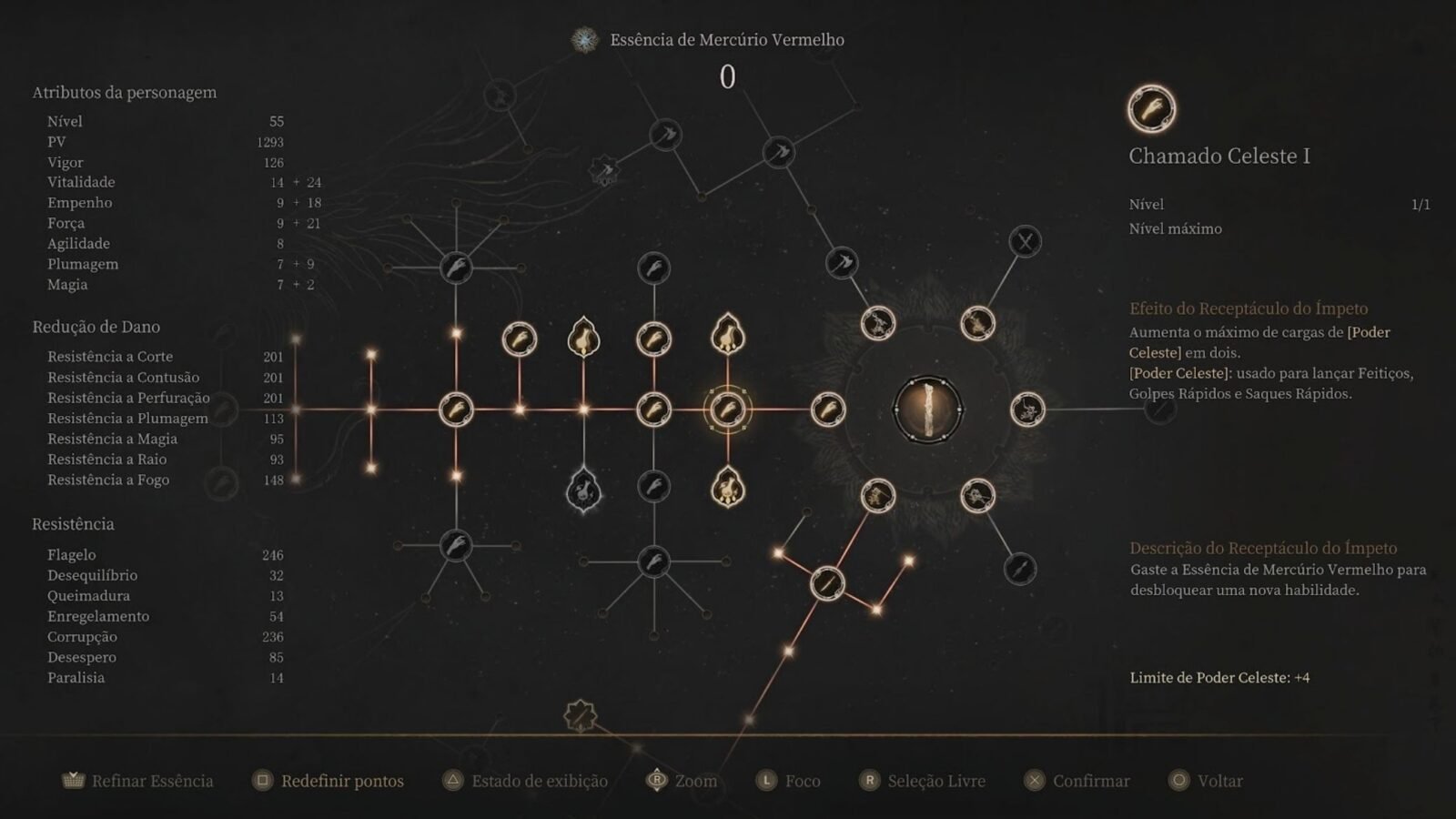 Na Disciplina, escolho e organizo habilidades das armas, explorando combos que aumentam o dano. A árvore de Plumagem concentra ataques mágicos e feitiços, oferecendo builds híbridas que combinam corpo a corpo e magia. Assim, a liberdade de teste é completa, e o progresso pode ser reiniciado a qualquer momento para experimentar combinações novas.
