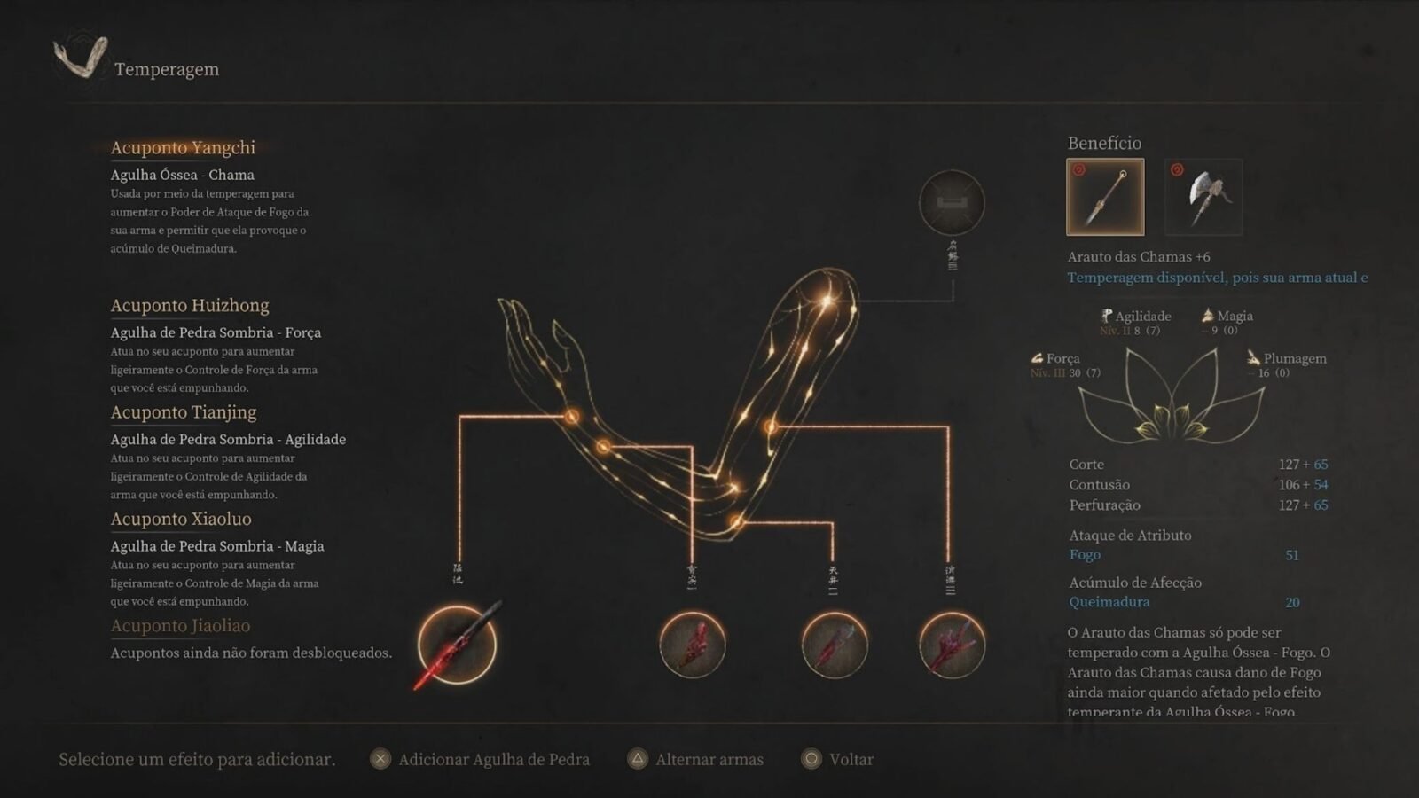 A aba da Temperagem permite equipar Agulhas Ósseas ou de Pedra, itens obtidos de chefes que liberam habilidades especiais.