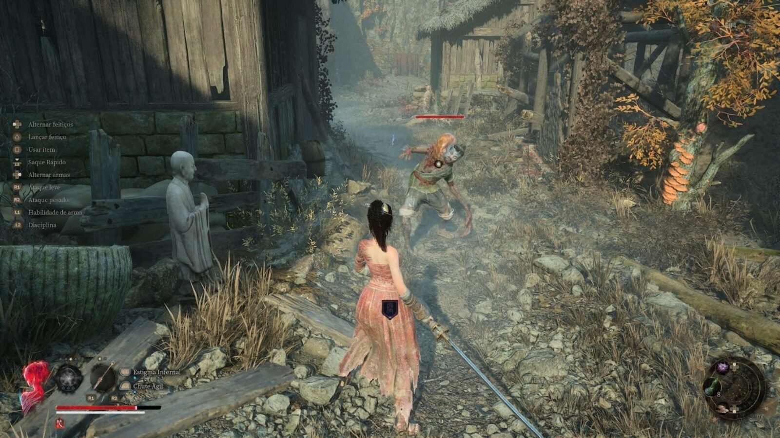 No lugar das tradicionais bonfires dos Souls, os santuários funcionam como pontos de descanso. Ao “entrar no sonho”, recupero vida e frascos de HP, mas todos os inimigos renascem.