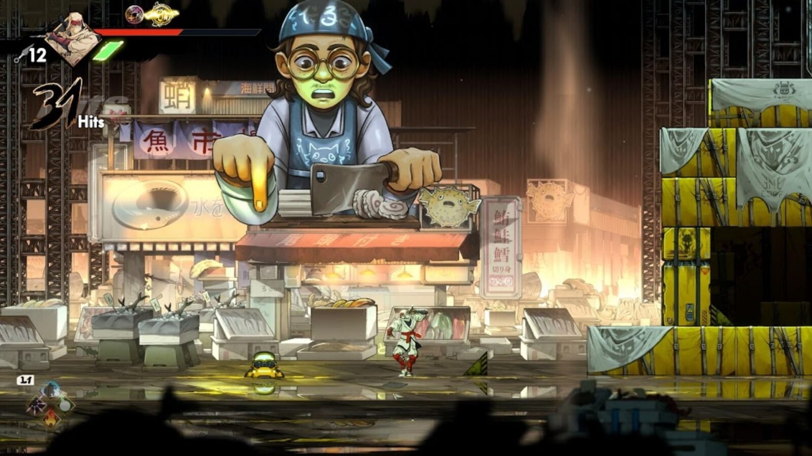 O primeiro ponto que chama atenção em Art of Vengeance é seu estilo artístico. A Lizardcube investiu em animações desenhadas à mão que fazem cada nível parecer uma obra de arte em movimento. São 14 fases diferentes, cada uma com sua identidade visual: do Mercado de Peixes, com plataformas móveis criadas a partir de expositores, ao Festival das Lanternas, com fogos de artifício brilhando sobre telhados e ruas animadas.