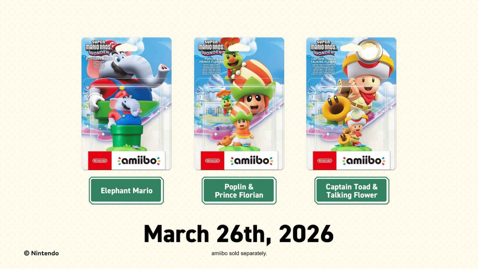 Junto com o lançamento do jogo, três novos amiibo também chegam ao mercado, sendo eles: Elephant Mario, Poplin & Prince Florian e Captain Toad & Talking Flower.