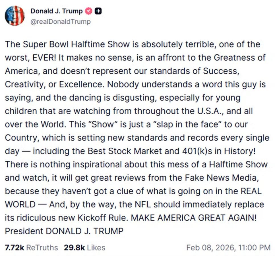 Após o show de Bad Bunny no intervalo do Super Bowl neste domingo (8), o presidente dos EUA, Donald Trump, demonstrou que não gostou da apresentação e fez um comentário inflamado em sua rede social, Truth Social, logo após o fim da performance.